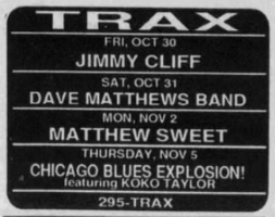 There was a second set played, but no recording or setlist is known to exist. Some tapes of this show contain a 30-minute Tim Reynolds acoustic performance as filler, but there is no evidence that it has any connection to this show (and, in fact, given some of the songs it includes, is probably from at least a few years later). First known show containing Blue Water > Minarets. First time Richard Hardy has guested. After the set closer on 10.27.92 Dave tells the crowd to come out on Saturday night (this show) to hear the five new songs he promised that evening but didn't play. Perhaps they were played during the second set, perhaps not at all... Only a complete tape will tell us. After performing Halloween during the Dave and Carter: The Warehouse Session, Dave and Carter talk about this debut performance of the song.